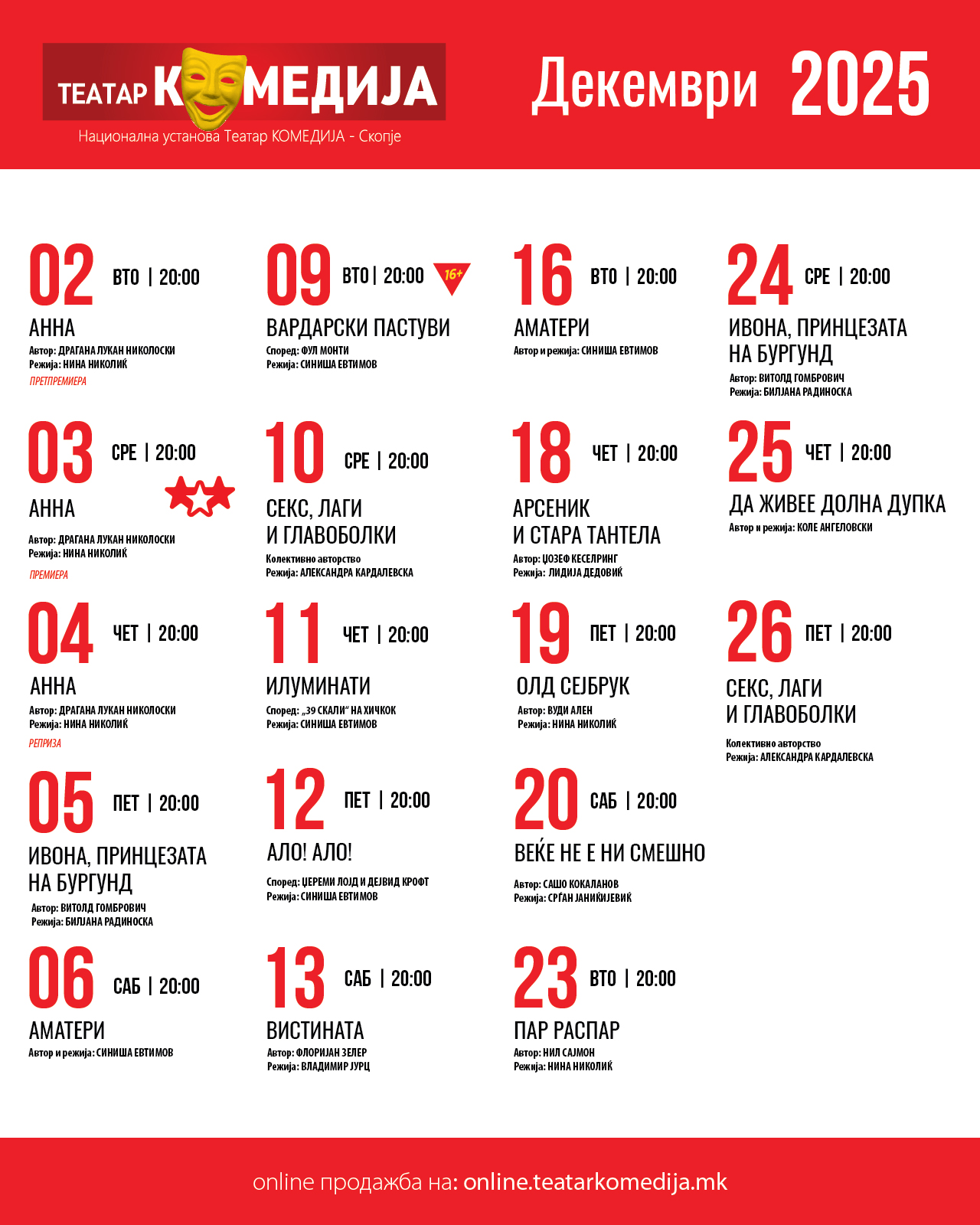 НУ Театар Комедија, за драмска дејност за која, за 2025 година е обезбеден буџет од страна на Министерството на Република Македонија од 2.400.000,00 мкд, по претходна согласност од управниот одбор, даде согласност финансиските средства да бидат распоредени во следниве три проекти: 1. „Секс, лаги и главоболки”, во режија на Александра Кардалевска (колективно авторство) во висина од 200.000 мкд. 2. „Аматери”, во режија на Синиша Евтимов (според Луис, Шилдс и Џонатан) во висина од 1.400.000 мкд. 3. „Ивона, принцезата на Бургунд”, во режија на Билјана Радиноска, во висина од 800.000 ден.